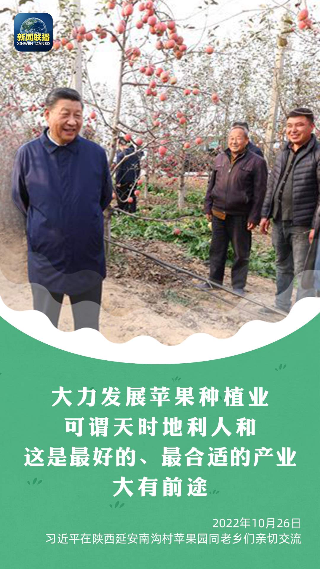 今年蘋果大豐收,總書記走進果園了解今年蘋果收成情況,詳細詢問了蘋果種植技術、銷售價格、村民收入等,老鄉(xiāng)們一一回答。總書記還現(xiàn)場采摘了一個紅紅的大蘋果。