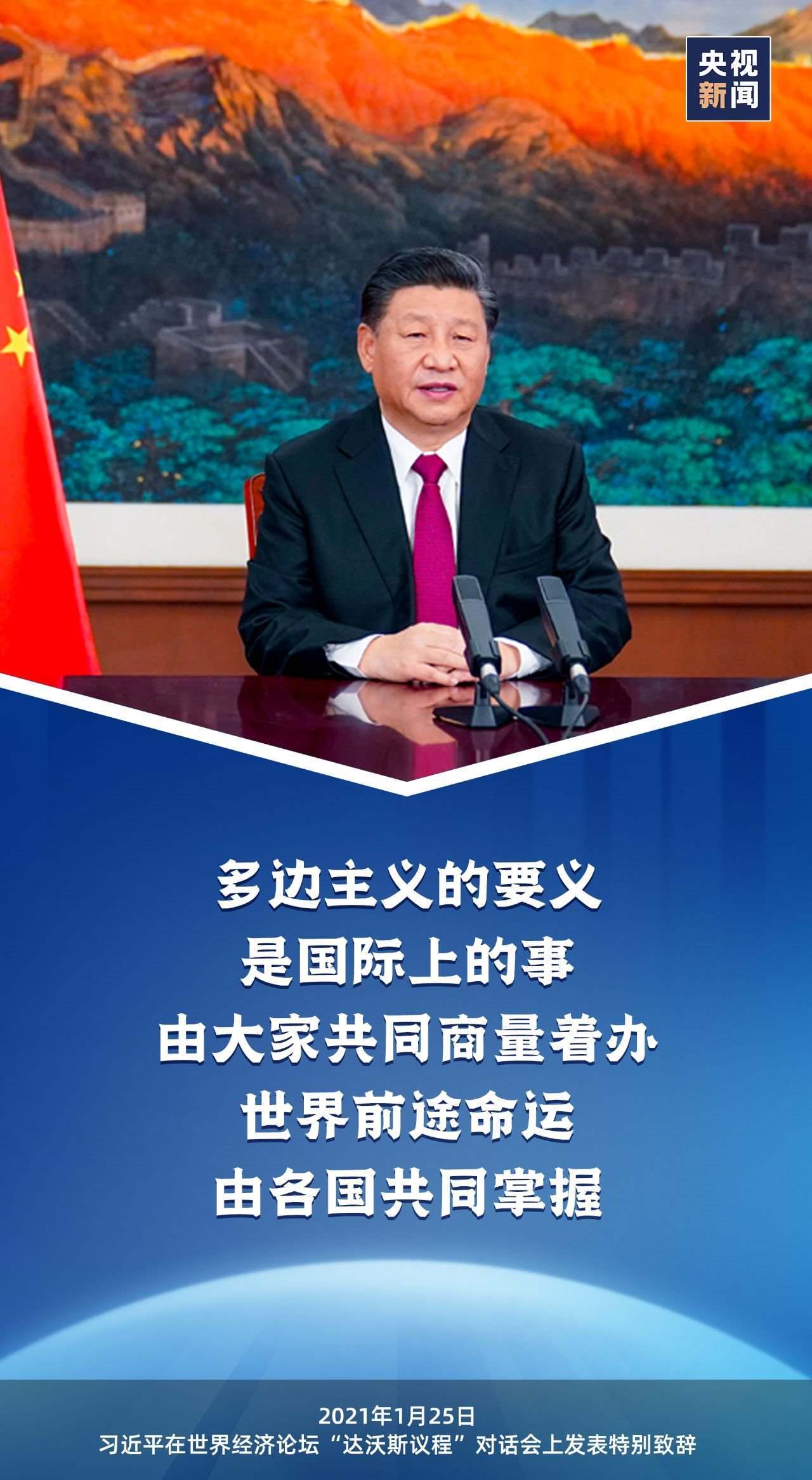 在2021年1月召開(kāi)的世界經(jīng)濟(jì)論壇“達(dá)沃斯議程”對(duì)話會(huì)上,習(xí)近平主席發(fā)表特別致辭,再次強(qiáng)調(diào)踐行多邊主義,并指出“多邊主義的要義是國(guó)際上的事由大家共同商量著辦”。