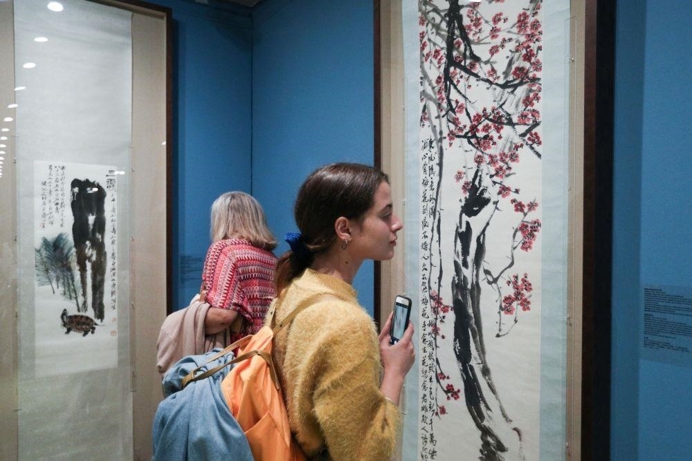 △觀眾在希臘雅典塞奧哈拉基斯藝術(shù)基金會美術(shù)館觀看中國的藝術(shù)展。