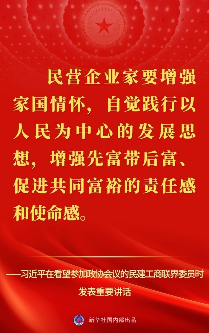 “黨中央始終堅持‘兩個毫不動搖’、‘三個沒有變’,始終把民營企業(yè)和民營企業(yè)家當作自己人。”3月6日,習近平總書記在看望參加全國政協(xié)十四屆一次會議的民建、工商聯(lián)界委員并參加聯(lián)組會時發(fā)表重要講話,強調(diào)要引導民營企業(yè)和民營企業(yè)家正確理解黨中央方針政策,增強信心、輕裝上陣、大膽發(fā)展。