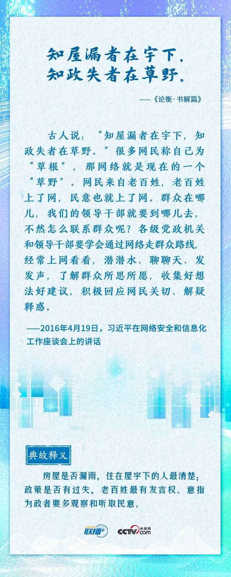 “知屋漏者在宇下,知政失者在草野”“日日行,不怕千萬里;常常做,不怕千萬事”......2016年4月19日,習近平總書記在網(wǎng)絡(luò)安全和信息化工作座談會上,從六個方面深刻回答了事關(guān)我國網(wǎng)信事業(yè)發(fā)展的一系列重大理論和實踐問題,并多次引經(jīng)據(jù)典加以闡述。