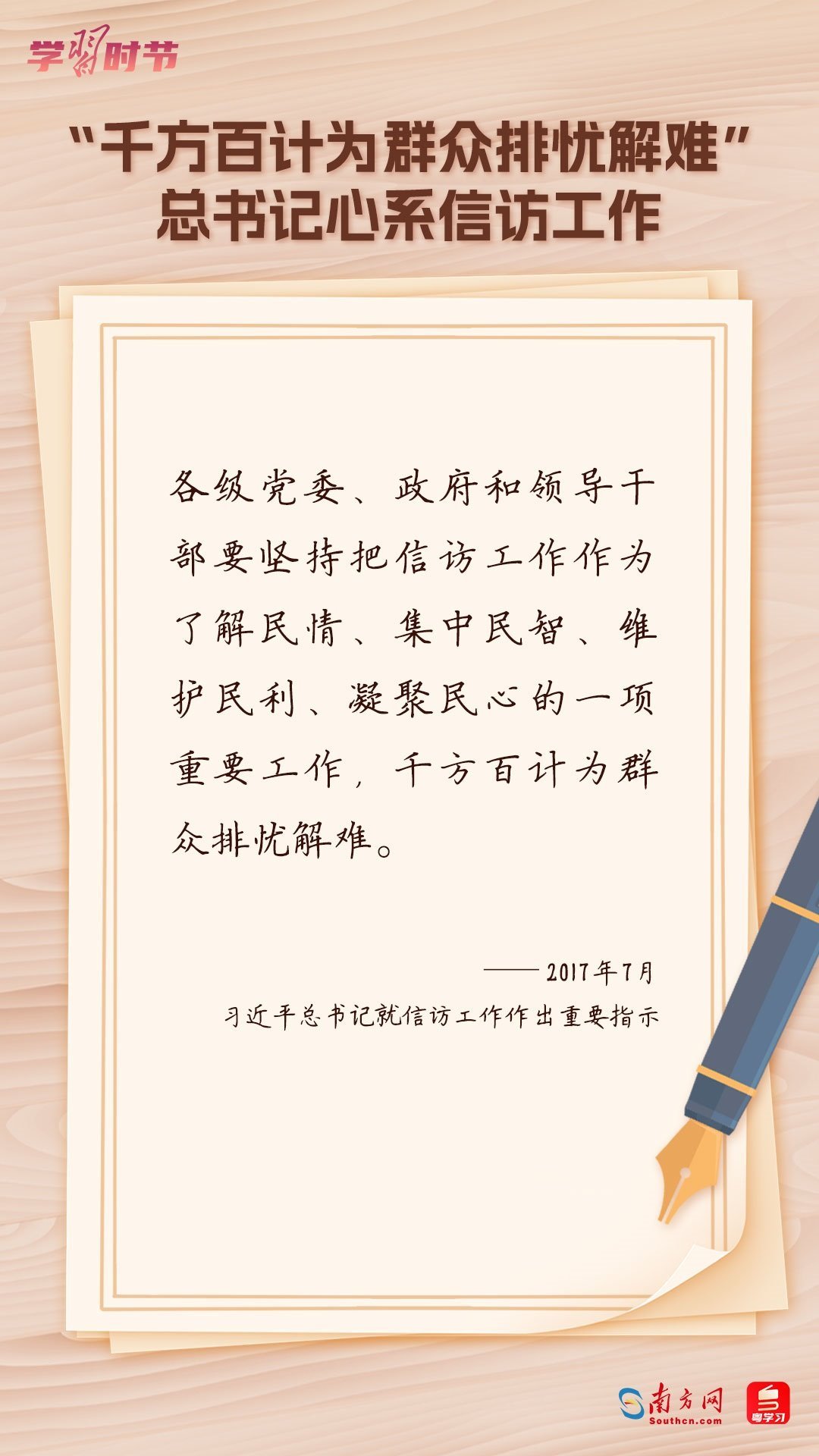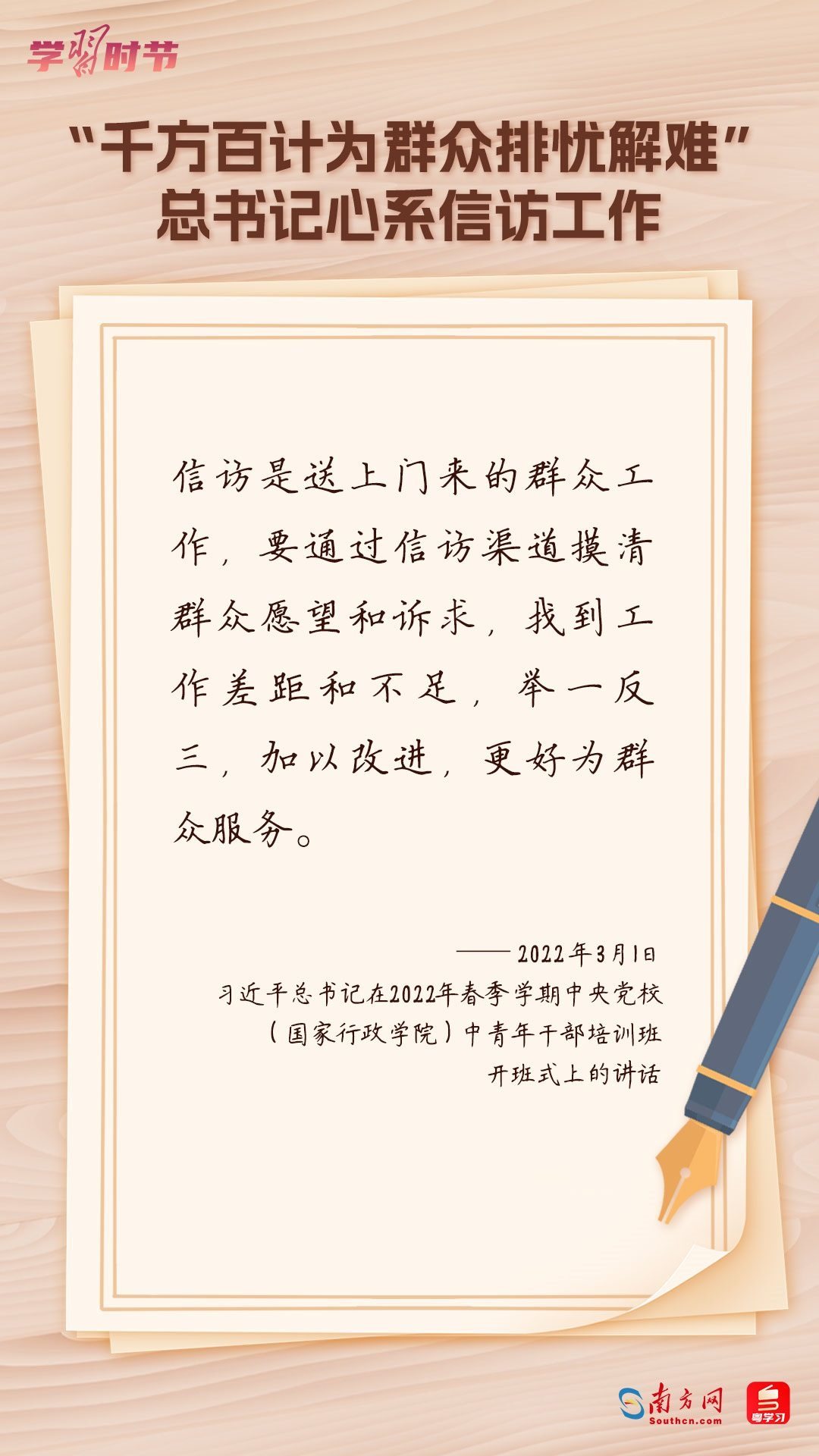2022年5月1日,中共中央、國(guó)務(wù)院印發(fā)的《信訪工作條例》正式實(shí)施。《信訪工作條例》以習(xí)近平新時(shí)代中國(guó)特色社會(huì)主義思想為指導(dǎo),深入貫徹習(xí)近平總書(shū)記關(guān)于加強(qiáng)和改進(jìn)人民信訪工作的重要思想,總結(jié)黨長(zhǎng)期以來(lái)領(lǐng)導(dǎo)和開(kāi)展信訪工作經(jīng)驗(yàn)特別是黨的十八大以來(lái)信訪工作制度改革成果,堅(jiān)持和加強(qiáng)黨對(duì)信訪工作的全面領(lǐng)導(dǎo),理順信訪工作體制機(jī)制,是新時(shí)代信訪工作的基本遵循。今年5月1日是《信訪工作條例》實(shí)施一周年,“學(xué)習(xí)時(shí)節(jié)”整理摘錄習(xí)近平總書(shū)記關(guān)于信訪工作的重要講話和重要指示批示,與您一同學(xué)習(xí)。