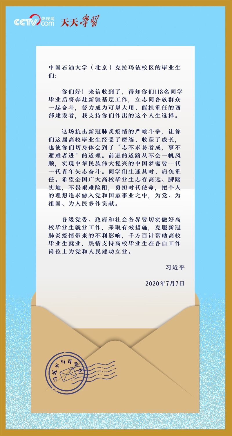 2020年畢業(yè)季,中國石油大學(xué)(北京)克拉瑪依校區(qū)118名即將到新疆基層就業(yè)的大學(xué)生,在離開母校之際,給習(xí)近平總書記寫信匯報了大學(xué)四年學(xué)習(xí)和思想上的收獲,表達了立志同各族群眾一起奮斗、建設(shè)美麗邊疆的決心。