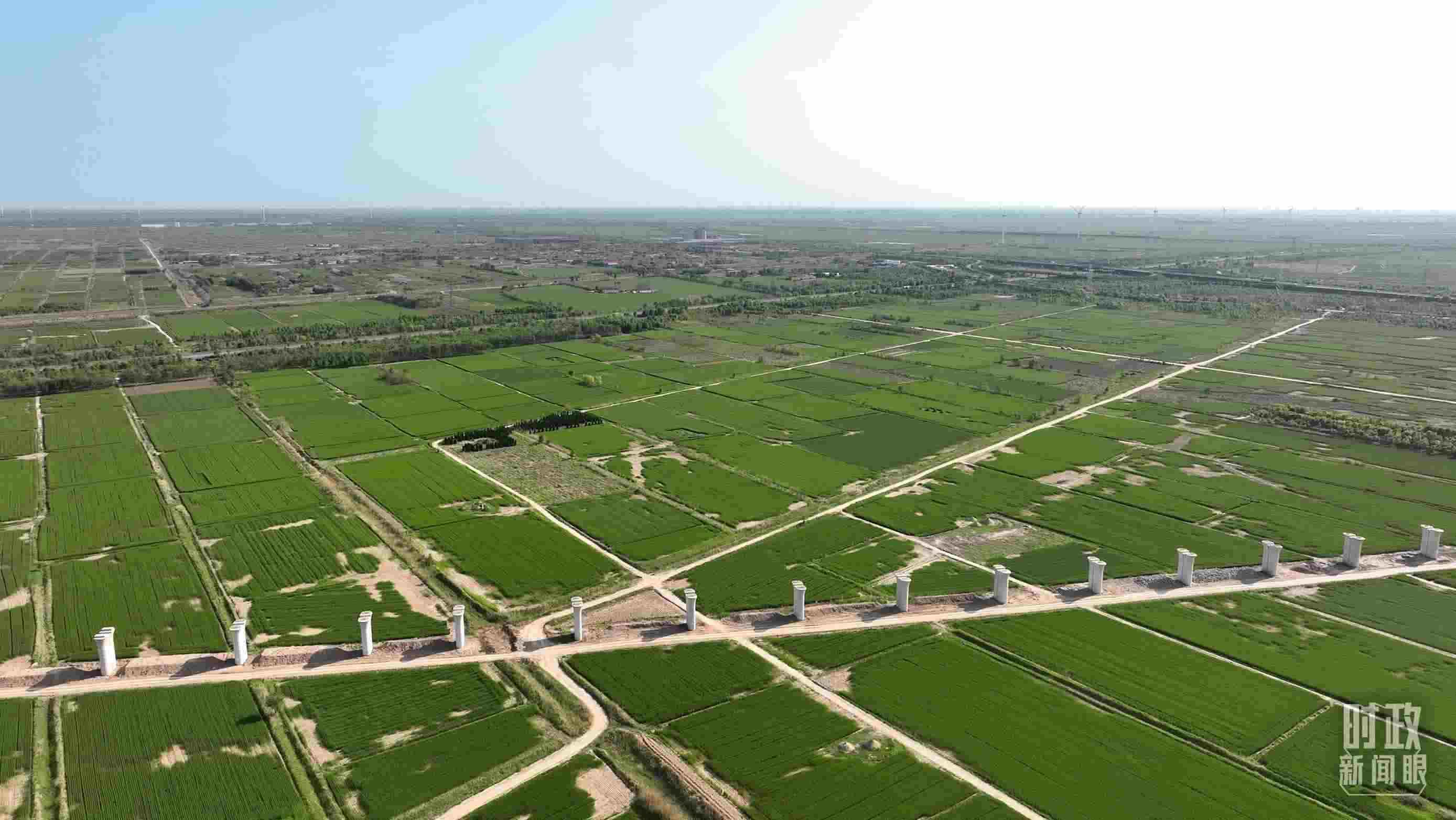 △旱堿麥田被分割成整齊劃一的綠色方塊。(總臺記者郭永良拍攝)