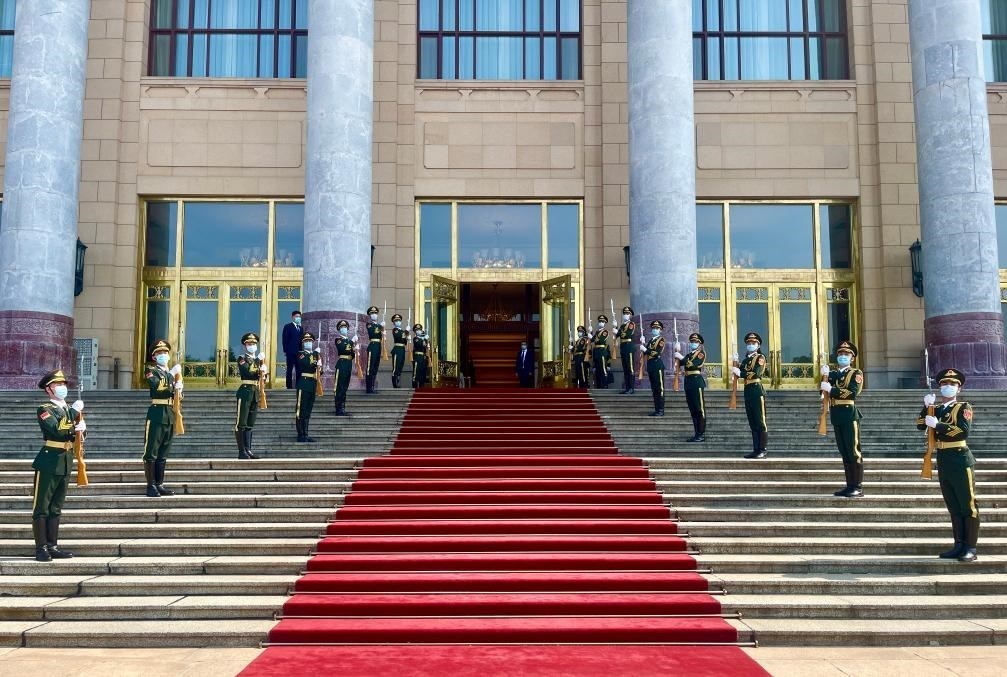 會(huì)談前,習(xí)近平在人民大會(huì)堂東門外廣場(chǎng)為伊薩亞斯舉行歡迎儀式。