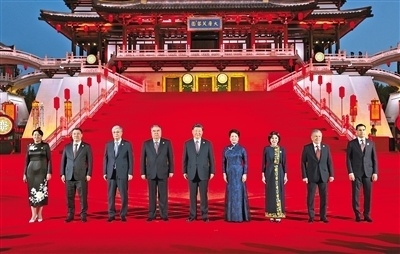 習近平夫婦為貴賓舉行唐朝傳統(tǒng)迎賓儀式。紫云樓前,禮樂和鳴,明快有力的古代佾舞、絢麗婀娜的芙蓉花舞,表達了古都西安人民的熱情好客,體現(xiàn)了中華文化兼容并蓄的精神風貌。