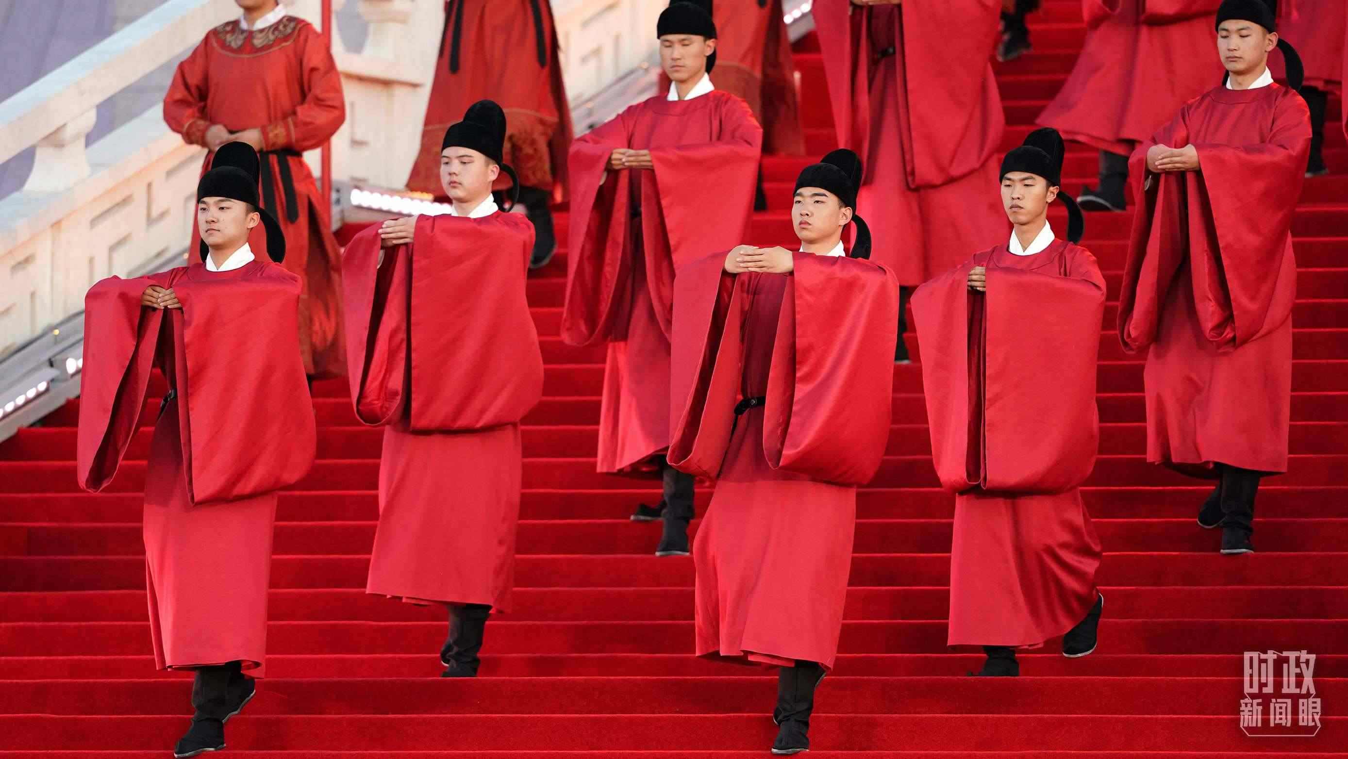 比如,迎賓表演中身著唐代紅色官服的男子,雙手平伸,指尖交錯,左手在外,掌心向內(nèi),舉手至額,欠身行禮,以中國傳統(tǒng)的“天揖禮”表達對賓客的敬意。