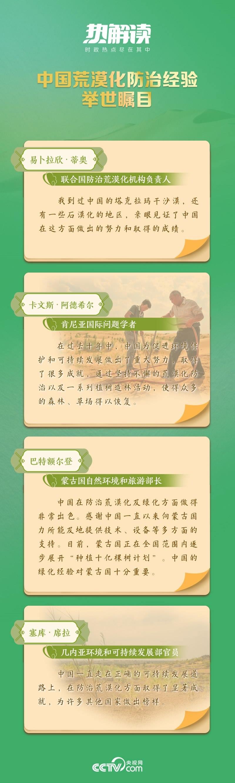 從“荒漠化防治是人類(lèi)功在當(dāng)代、利在千秋的偉大事業(yè)”,到“防治荒漠化是人類(lèi)面臨的共同挑戰(zhàn),需要國(guó)際社會(huì)攜手應(yīng)對(duì)”,再到“堅(jiān)持系統(tǒng)觀念,扎實(shí)推進(jìn)山水林田湖草沙一體化保護(hù)和系統(tǒng)治理”……在習(xí)近平生態(tài)文明思想指引下,中國(guó)積極行動(dòng),形成了政府主導(dǎo)、全民參與、科技支撐、法規(guī)保障的治沙模式,取得了顯著成效。