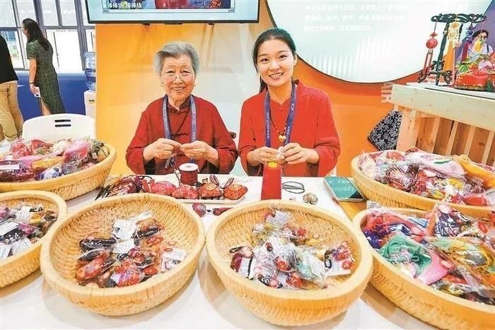 △王秀英和孫女孫歌堯展示“針棒香包”制作技藝。