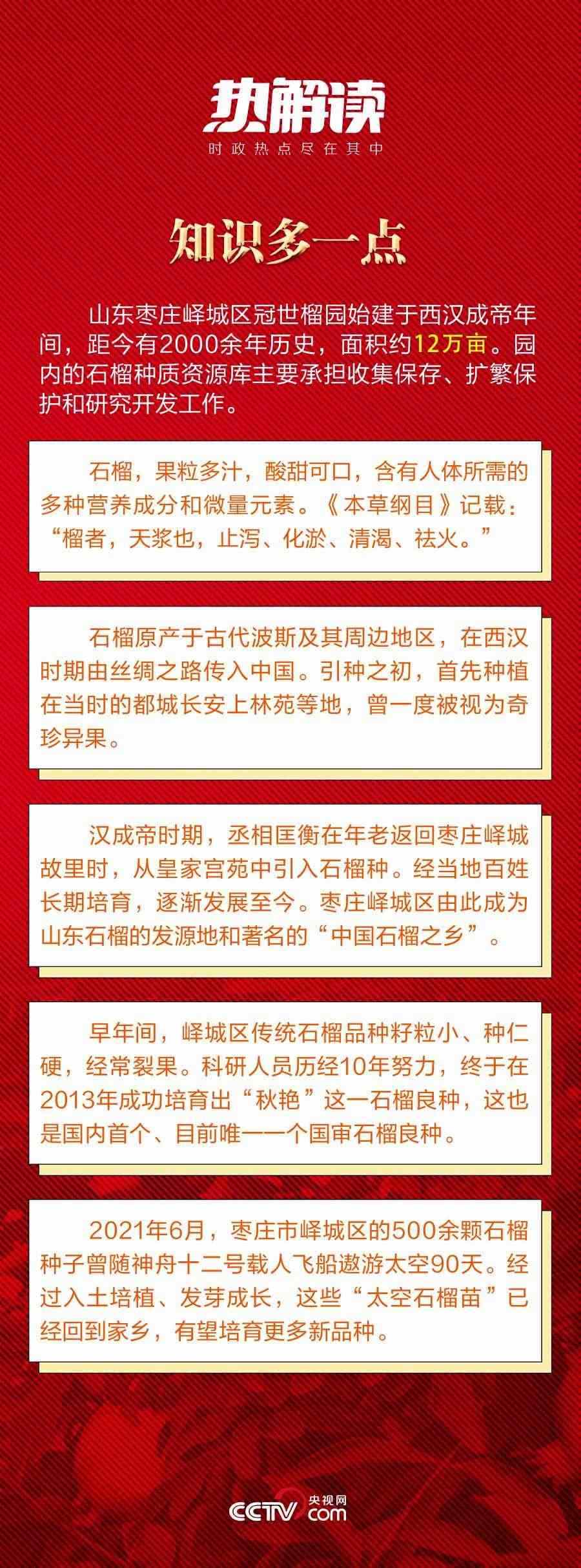 歷經(jīng)千年,當(dāng)年自異域“舶來”的奇珍異果,已經(jīng)成為遍地開花的致富果、幸福果。山東棗莊火紅的石榴給這座小城帶來了紅火的發(fā)展機(jī)遇,也給老百姓帶來了紅火的生活。
