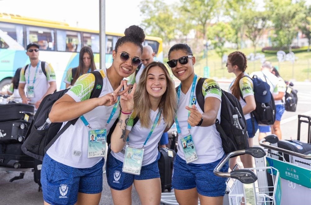 △2023年7月22日,巴西代表團(tuán)成員抵達(dá)中國(guó)四川成都大運(yùn)村后合影。