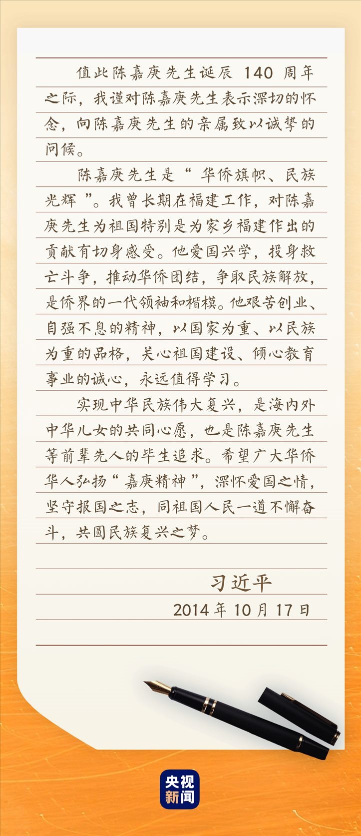 2014年10月21日,福建廈門。紀念陳嘉庚誕辰140周年座談會現場,雷鳴般的掌聲經久不息。習近平總書記的回信,讓大家激動不已——