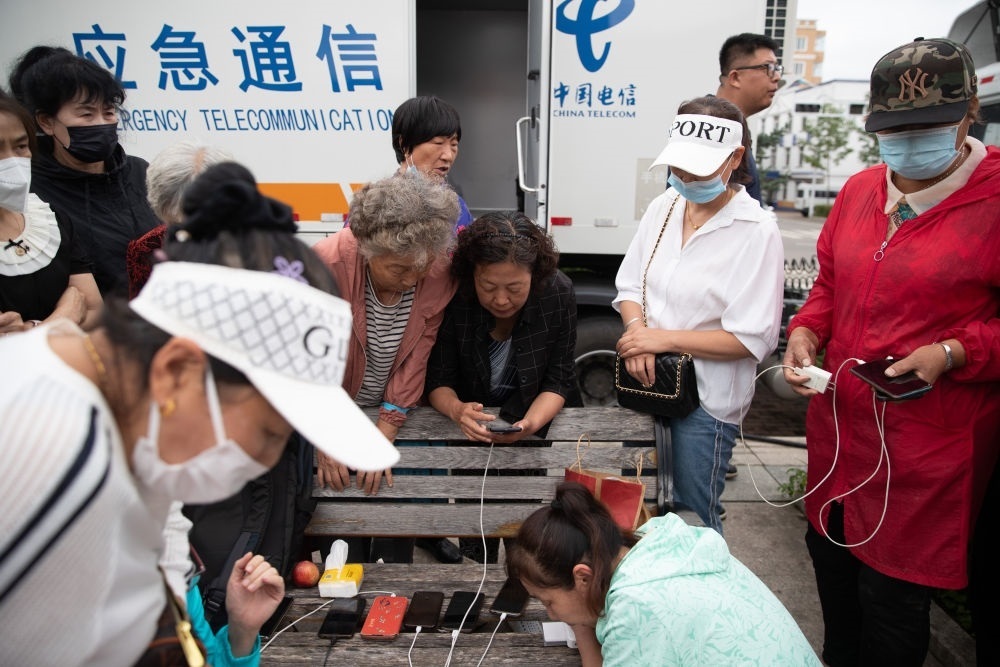 8月6日,群眾在黑龍江省海林市長(zhǎng)汀鎮(zhèn)一廣場(chǎng)上的應(yīng)急通信車(chē)前與外界通話(huà)。