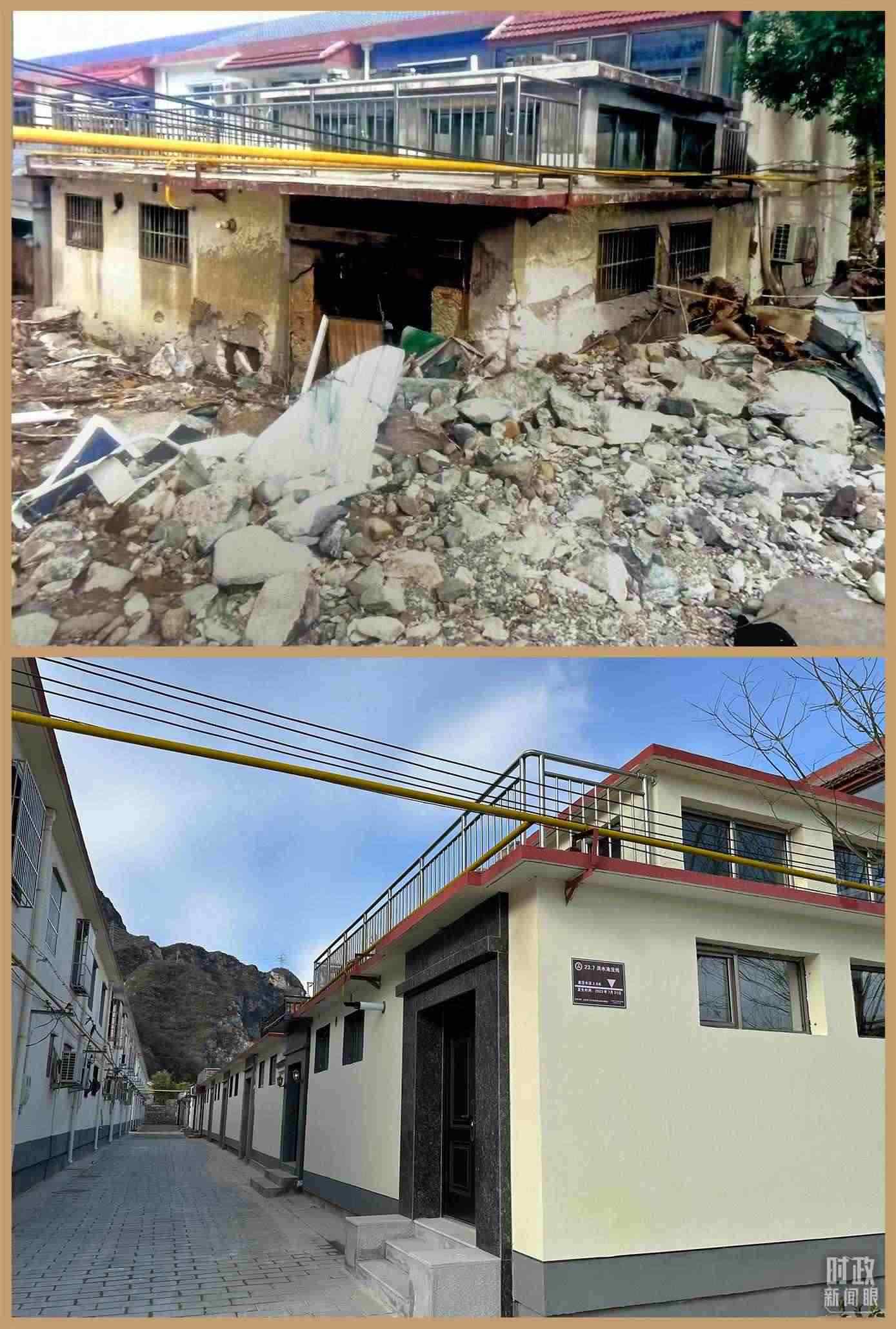 △ 村民房屋遭遇洪災(zāi)與災(zāi)后重建的對比圖。(總臺(tái)央視記者范一鳴拍攝)