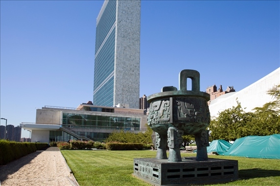 這是2015年9月15日在美國紐約聯(lián)合國總部拍攝的“世紀寶鼎”?!笆兰o寶鼎”是中國在1995年聯(lián)合國成立50周年之際,贈送給聯(lián)合國的禮物。新華社記者 李木子 攝