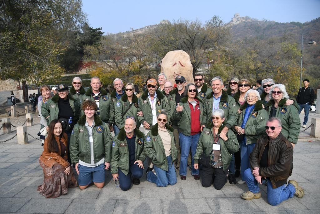 2023年10月29日,飛虎隊老兵莫耶一行人在北京八達嶺長城合影留念。當日,美中航空遺產(chǎn)基金會訪華代表團成員陸續(xù)抵達北京。新華社記者 任超 攝