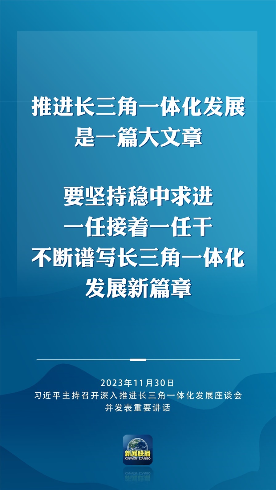 習(xí)近平強調(diào),要完整、準(zhǔn)確、全面貫徹新發(fā)展理念,緊扣一體化和高質(zhì)量這兩個關(guān)鍵詞,樹立全球視野和戰(zhàn)略思維,堅定不移深化改革、擴大高水平開放,統(tǒng)籌科技創(chuàng)新和產(chǎn)業(yè)創(chuàng)新,統(tǒng)籌龍頭帶動和各揚所長,統(tǒng)籌硬件聯(lián)通和機制協(xié)同,統(tǒng)籌生態(tài)環(huán)保和經(jīng)濟發(fā)展,在推進共同富裕上先行示范,在建設(shè)中華民族現(xiàn)代文明上積極探索,推動長三角一體化發(fā)展取得新的重大突破,在中國式現(xiàn)代化中走在前列,更好發(fā)揮先行探路、引領(lǐng)示范、輻射帶動作用。