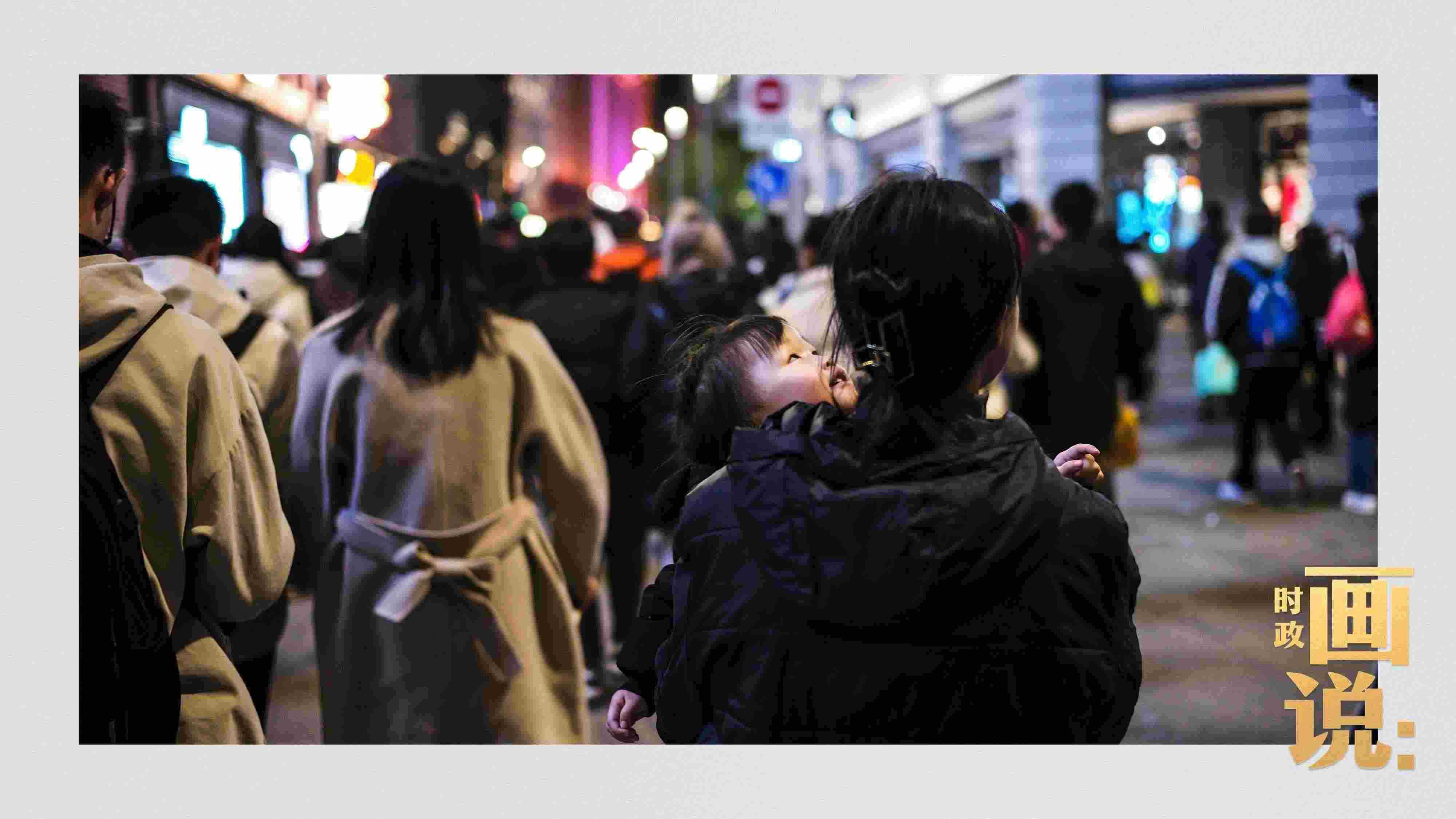 △母親懷抱中的小女孩仰望燈火璀璨的高樓大廈。南京路步行街,上海。