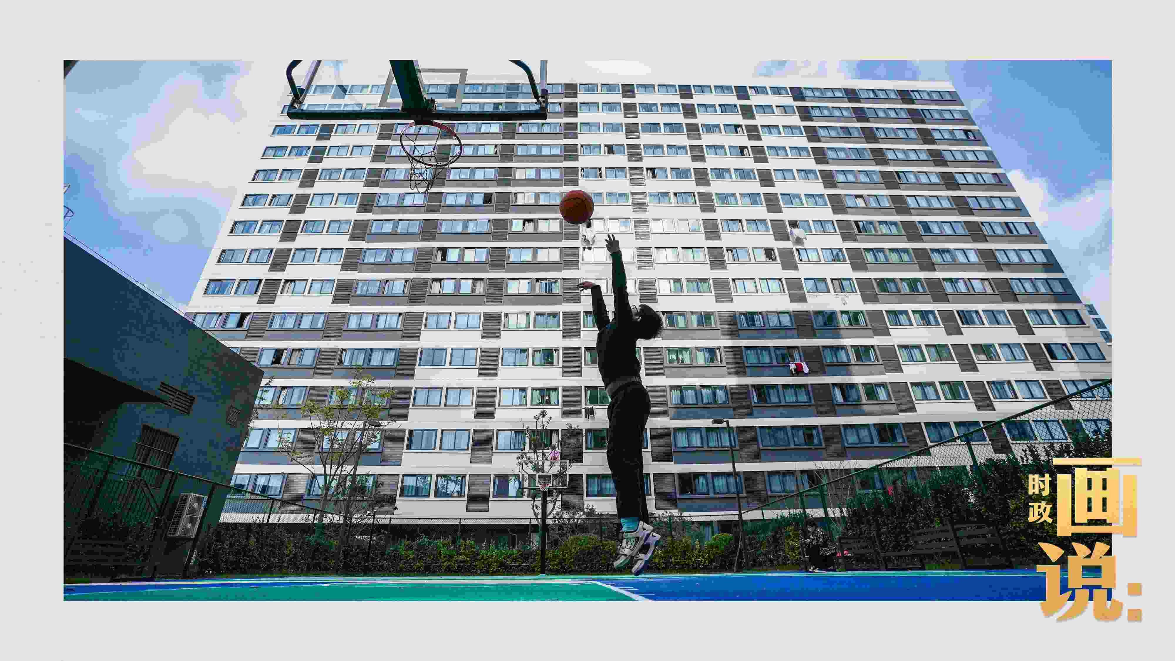 △社區(qū)籃球場上練習投籃的小男孩。閔行區(qū)新時代城市建設(shè)者管理者之家所在的社區(qū)是上海市首批大型保障性租賃住房項目之一,為許多來滬新市民、青年人和一線務工人員提供住房保障。閔行區(qū),上海。