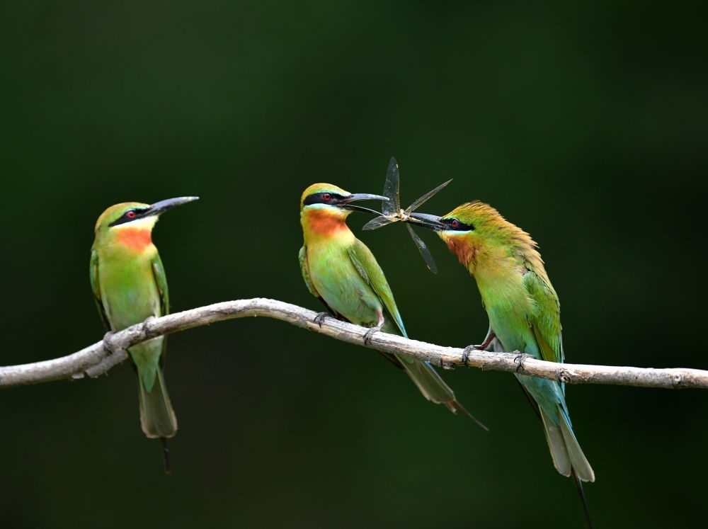 在廈門五緣灣栗喉蜂虎自然保護(hù)區(qū)騎馬山片區(qū),一只栗喉蜂虎雄鳥(右)給兩只雌鳥喂食昆蟲(2023年5月20日攝)。新華社記者 魏培全 攝