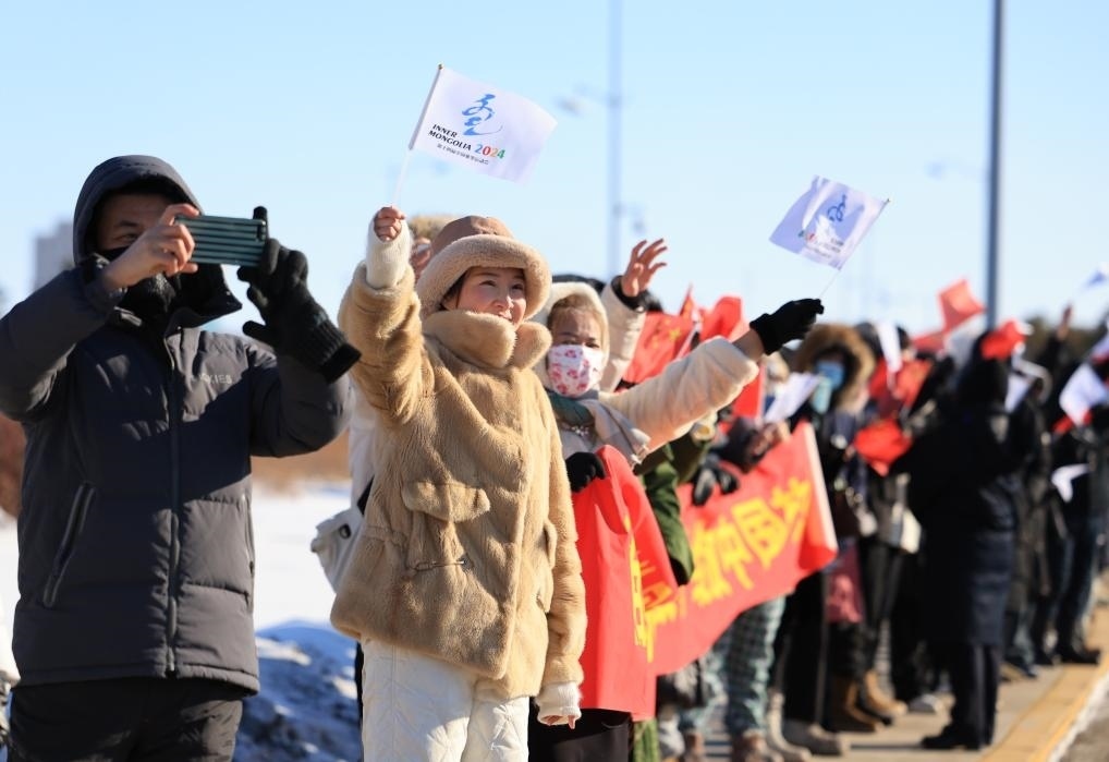 2月3日,在內蒙古呼倫貝爾市舉行的“十四冬”火炬?zhèn)鬟f活動上,路邊群眾揮手歡呼。新華社發(fā)(康文魁攝)