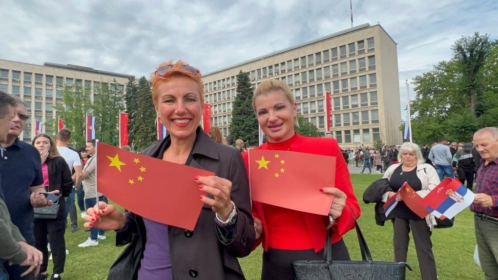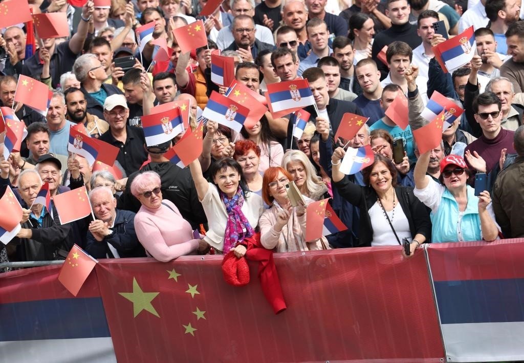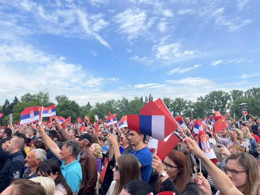 大廈廣場上,一萬五千名塞爾維亞民眾揮舞中塞兩國國旗,對習近平表示最熱烈的歡迎。