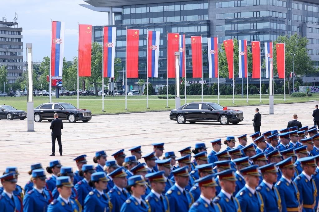 塞爾維亞大廈前,中塞兩國國旗迎風飄揚,儀仗隊威武雄壯。