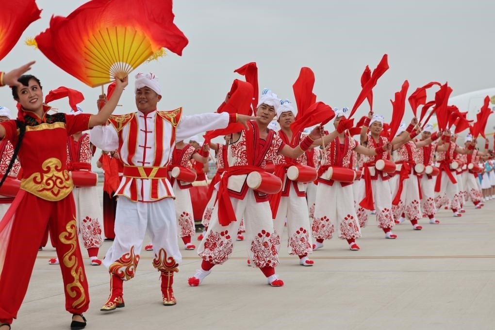 2023年5月17日下午,出席中國-中亞峰會的哈薩克斯坦總統(tǒng)托卡耶夫抵達(dá)陜西省西安市。當(dāng)?shù)孛癖娨詿崆榈难?、歡快的秧歌等民間藝術(shù)表演歡迎貴賓到來。新華社記者 邢廣利 攝