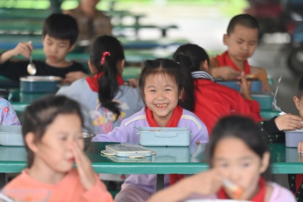 5月31日,廣西柳州市柳江區(qū)三都鎮(zhèn)覺山教學(xué)點(diǎn),學(xué)生們?cè)诔誀I養(yǎng)午餐。