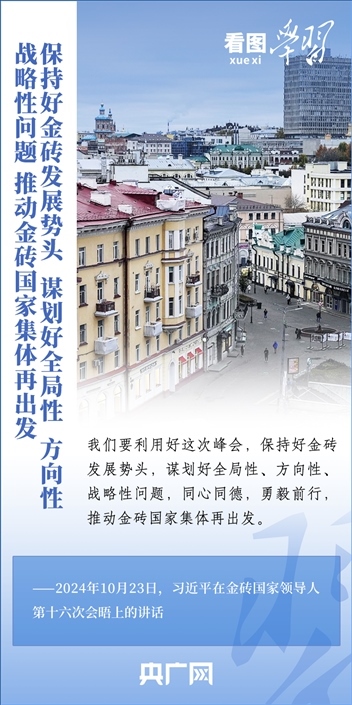 當?shù)貢r間10月23日,國家主席習近平在俄羅斯喀山出席金磚國家領導人第十六次會晤并發(fā)表重要講話。習主席深刻闡述推動“大金磚合作”高質量發(fā)展的中國主張,就金磚大家庭發(fā)展合作提出五點務實舉措,表達了中方愿同金磚各國一道,攜手更多“全球南方”國家共同推動構建人類命運共同體的真誠愿望。一起來學習!