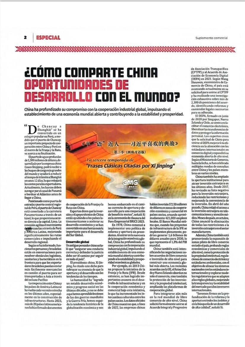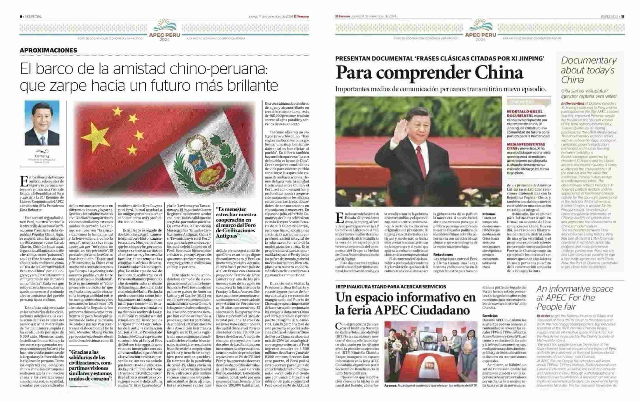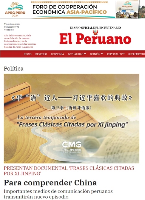11月14日,秘魯最具影響力的官方報紙《秘魯人報》刊發(fā)節(jié)目在秘魯落播的消息。文章指出,《平“語”近人——習(xí)近平喜歡的典故》第三季展現(xiàn)了中華民族開放包容、兼收并蓄的文化胸懷,闡釋了習(xí)近平主席提出的推動構(gòu)建人類命運(yùn)共同體的這一重大理念,是對“建設(shè)一個什么樣的世界、怎樣建設(shè)這個世界”給出的中國方案。《秘魯人報》特刊整版刊發(fā)《平“語”近人——習(xí)近平喜歡的典故》第三季(西班牙語版)將在秘魯主流媒體落播特稿。《秘魯人報》官網(wǎng)也同步刊發(fā)了節(jié)目預(yù)告消息和海報。