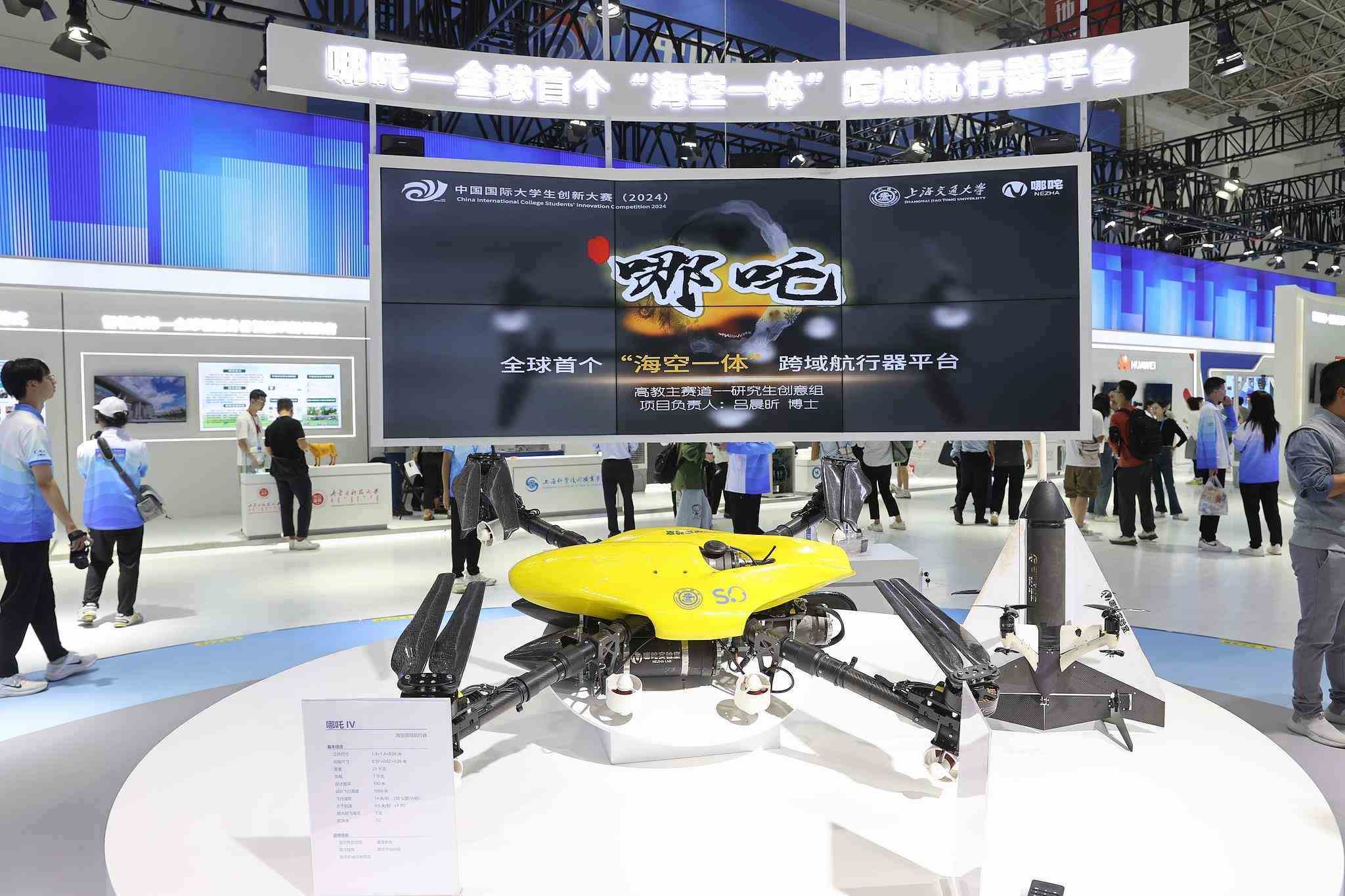 △2024年10月12日至15日,中國(guó)國(guó)際大學(xué)生創(chuàng)新大賽總決賽及同期活動(dòng)在上海舉行。來(lái)自上海交通大學(xué)的“哪吒——全球首個(gè)‘海空一體’跨域航行器平臺(tái)”項(xiàng)目奪得冠軍。