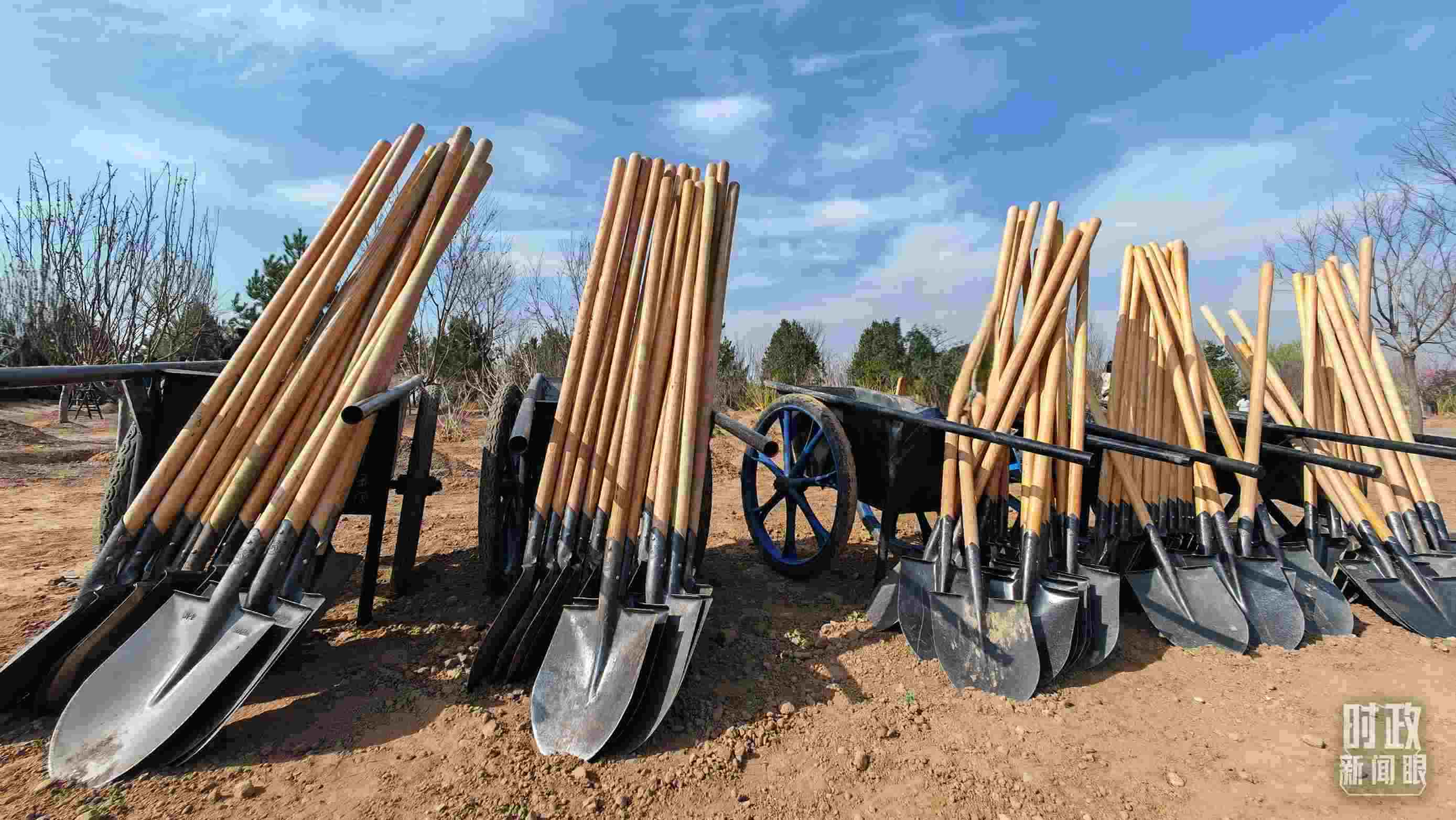 △植樹現(xiàn)場整齊擺放的工具。(總臺(tái)央視記者王策拍攝)