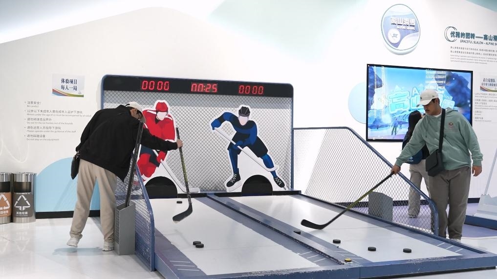 4月6日,北京奧運博物館,阿聯(lián)酋學(xué)生們體驗?zāi)M冰球。新華社記者 胡震澤 攝