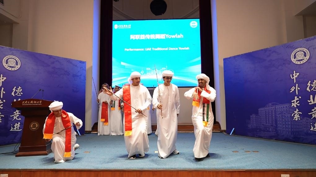 天津外國語大學(xué)的校園里,海棠盛開,綠意盎然。在此次交流學(xué)習(xí)項目的開班儀式上,中阿兩國學(xué)生代表以精彩演出互致青春問候:中國民族樂器齊奏《云之南》、中阿雙語演唱《我們都一樣》、節(jié)奏明快的阿聯(lián)酋傳統(tǒng)舞蹈點燃活動現(xiàn)場……