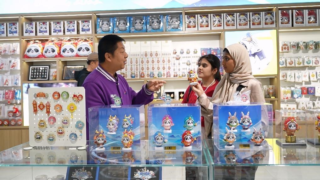 在第一站北京,她已給阿聯(lián)酋的親友準備了不少禮物:中華美景冰箱貼、中式小帽子、大熊貓鑰匙扣、印有長城圖案的杯子和紀念幣……在北京奧運博物館紀念品商店,她頭一次接觸中國潮玩,對憨態(tài)可掬的盲盒玩偶“龍墩墩”愛不釋手。