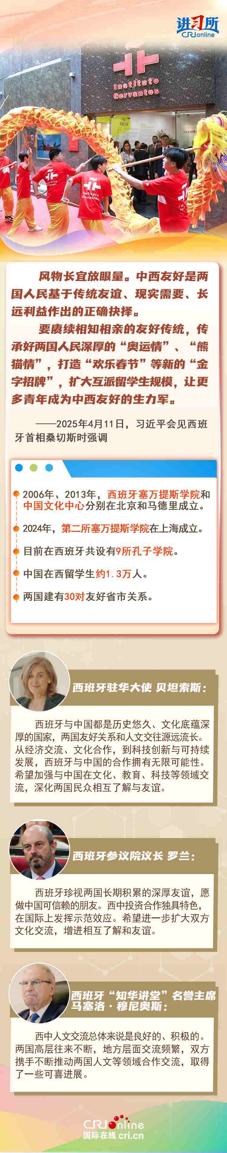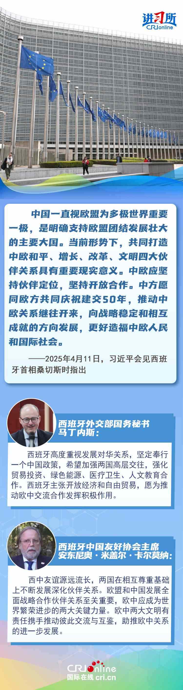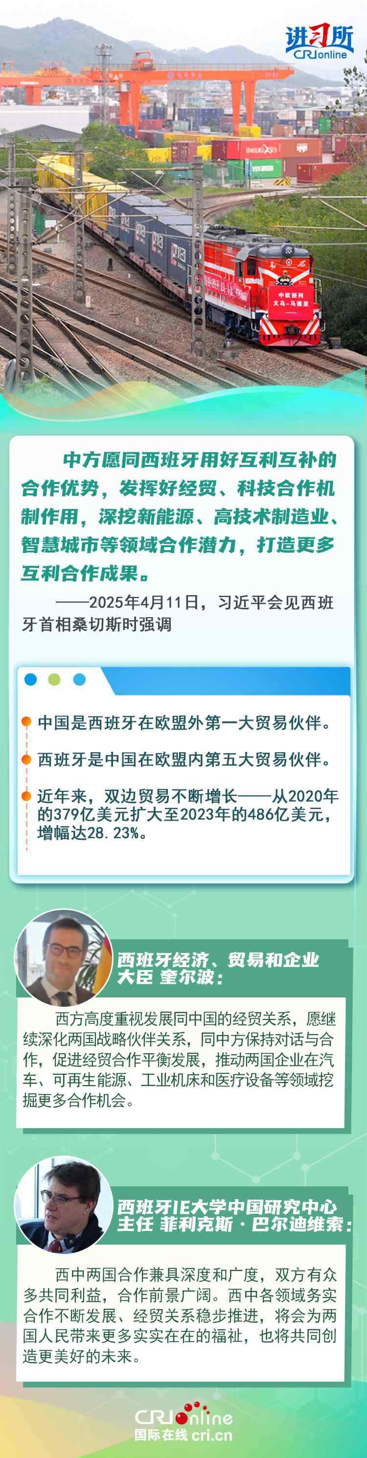 今年是中西全面戰(zhàn)略伙伴關(guān)系建立20周年,也是中歐建交50周年。多年來,中西兩國(guó)領(lǐng)導(dǎo)人保持密切互動(dòng),秉持互尊互信、互利共贏精神,兩國(guó)在深化貿(mào)易、投資、科技創(chuàng)新、綠色能源等領(lǐng)域取得豐富合作成果,雙邊關(guān)系走在中國(guó)同歐洲國(guó)家關(guān)系前列。在西班牙人士眼中,良好的對(duì)華關(guān)系對(duì)西班牙、歐洲和世界具有重要意義,將會(huì)為兩國(guó)人民帶來更多實(shí)實(shí)在在的福祉,也將共同創(chuàng)造更美好的未來。