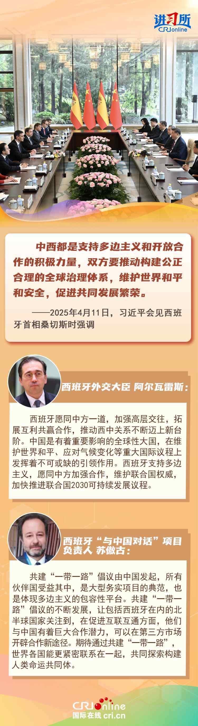 4月11日,中國(guó)國(guó)家主席習(xí)近平在北京會(huì)見來華訪問的西班牙首相桑切斯時(shí)表示,中西友好是兩國(guó)人民基于傳統(tǒng)友誼、現(xiàn)實(shí)需要、長(zhǎng)遠(yuǎn)利益作出的正確抉擇,中西都是支持多邊主義和開放合作的積極力量,雙方要推動(dòng)構(gòu)建公正合理的全球治理體系,維護(hù)世界和平和安全,促進(jìn)共同發(fā)展繁榮。