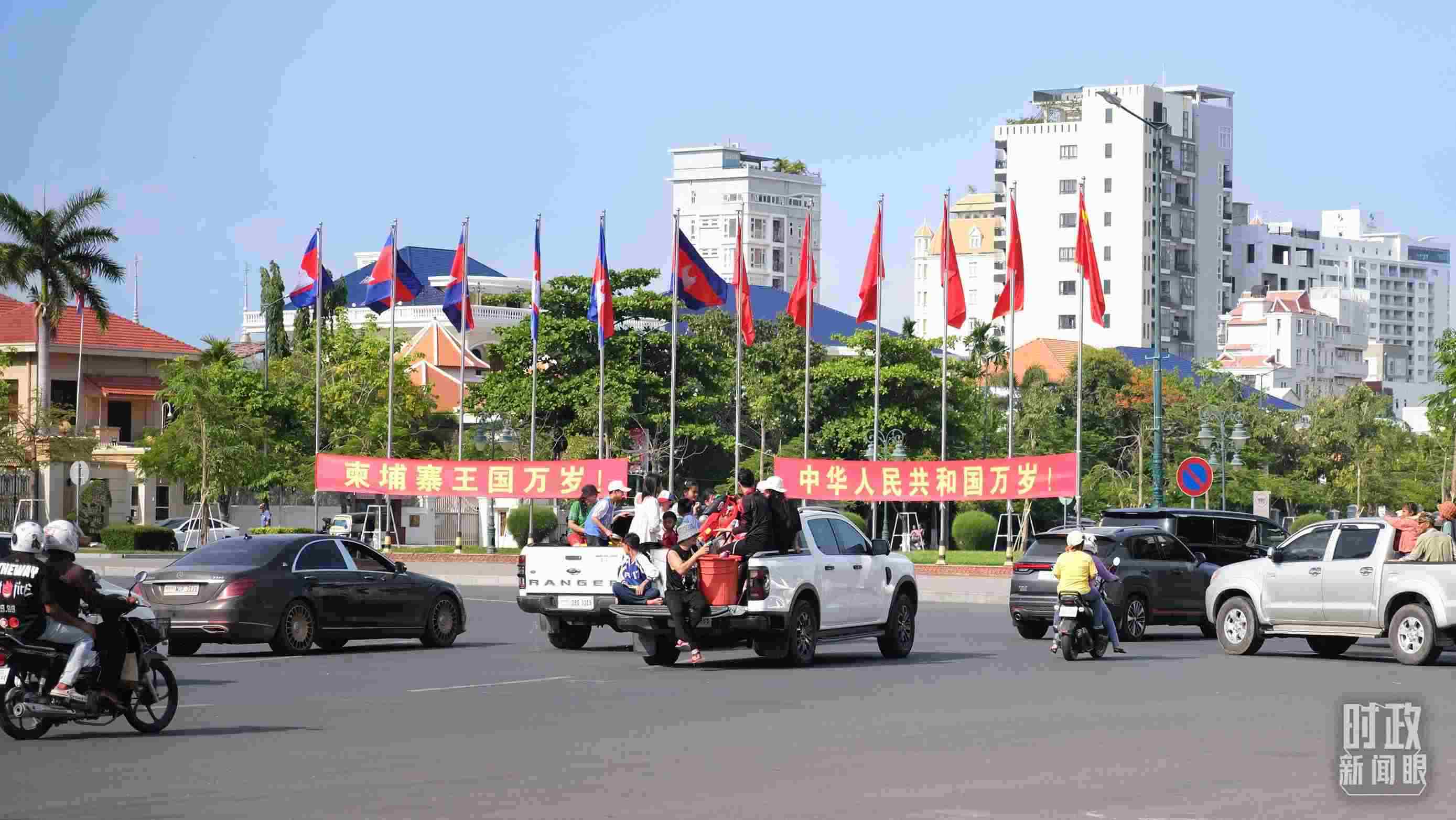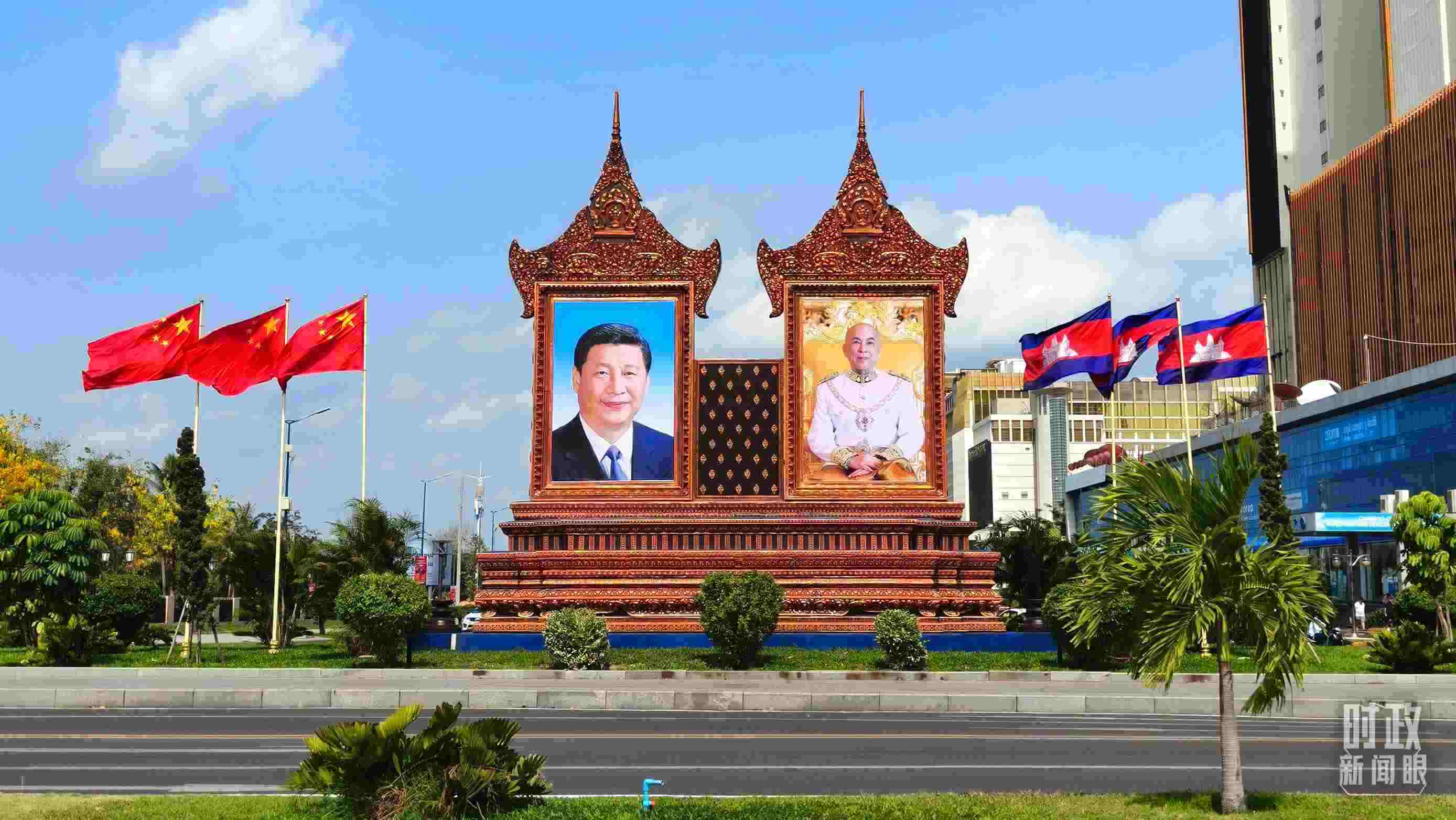 △金邊街頭的巨幅兩國領導人照片和兩國國旗。(總臺央視記者陸泓宇拍攝)