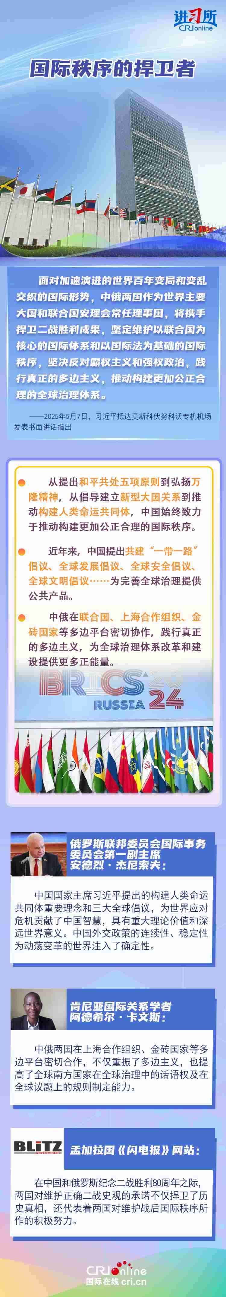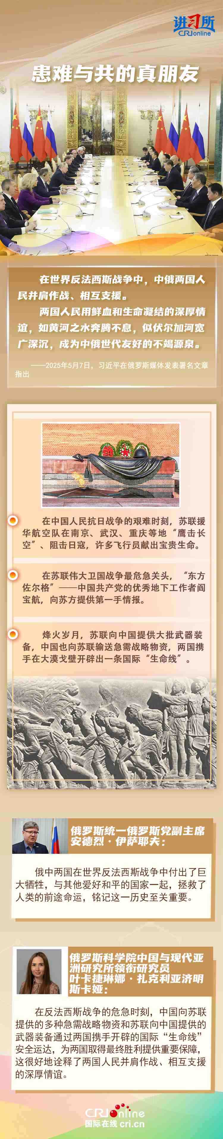 “兩國人民用鮮血和生命凝結的深厚情誼,如黃河之水奔騰不息,似伏爾加河寬廣深沉,成為中俄世代友好的不竭源泉。”今年是中國人民抗日戰(zhàn)爭、蘇聯(lián)偉大衛(wèi)國戰(zhàn)爭暨世界反法西斯戰(zhàn)爭勝利80周年,也是聯(lián)合國成立80周年。在這一重要歷史時間節(jié)點,習近平主席此訪不僅為中俄關系發(fā)展注入強勁動力,也向世界宣示中俄兩國攜手捍衛(wèi)二戰(zhàn)勝利成果的堅定意志。
