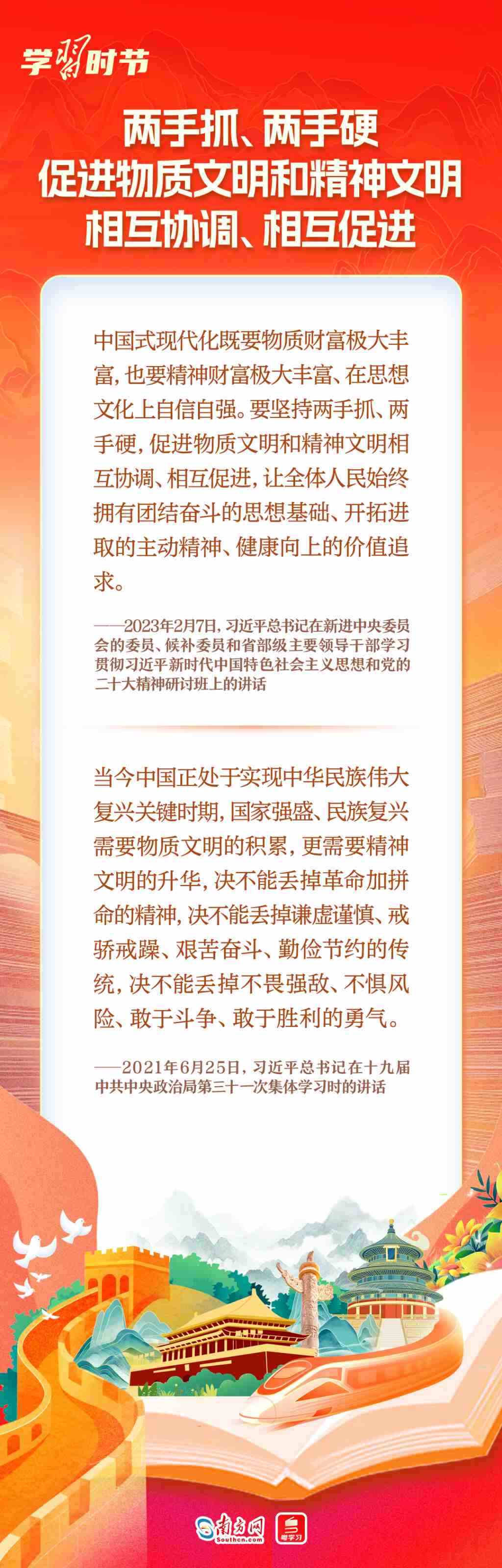 黨的十八大以來(lái),黨中央持續(xù)推進(jìn)社會(huì)主義精神文明建設(shè),鞏固壯大社會(huì)主流價(jià)值,全民族精神面貌更加奮發(fā)昂揚(yáng),人民文明素養(yǎng)和社會(huì)文明程度顯著提升。習(xí)近平總書(shū)記高度重視社會(huì)主義精神文明建設(shè),近年來(lái)在不同場(chǎng)合就精神文明建設(shè)發(fā)表了一系列重要論述,為改進(jìn)創(chuàng)新精神文明建設(shè)工作、豐富人民群眾精神文化生活指明了方向、提供了遵循。我們整理了相關(guān)論述,與您繼續(xù)深入學(xué)習(xí)領(lǐng)會(huì)。