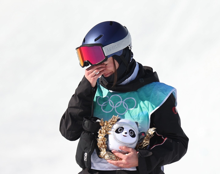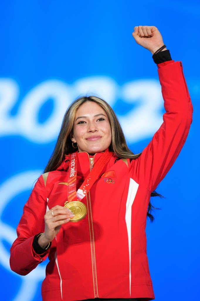 2月8日,冠軍中國選手谷愛凌在北京2022年冬奧會自由式滑雪女子大跳臺獎牌頒發(fā)儀式上。新華社記者鞠煥宗攝