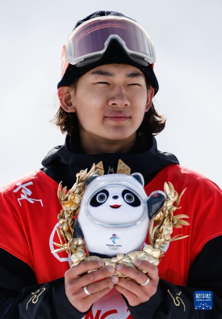 2月7日,中國選手蘇翊鳴在頒發(fā)紀念品儀式上。