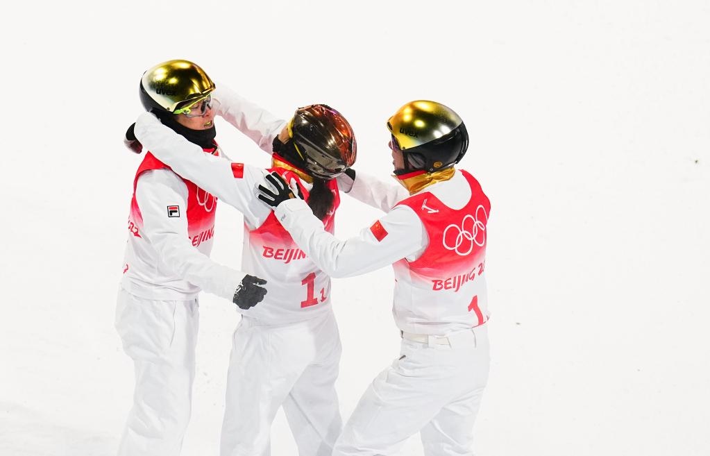 2月10日,中國隊選手徐夢桃(中)與隊友齊廣璞(左)、賈宗洋在賽后。新華社記者許暢攝