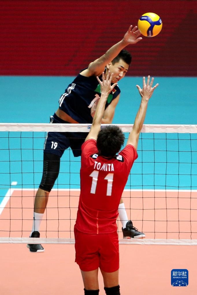 8月14日,中國隊(duì)球員張景胤(右一)在比賽中扣球。新華社記者 王騰 攝