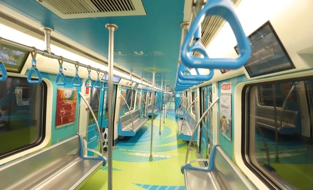整體車廂打造創(chuàng)新植入了色彩明快、充滿青春氣息的“移動運(yùn)動場”概念,立面畫面則結(jié)合青春動感的大學(xué)生形象,并選用田徑、網(wǎng)球、籃球、體操等運(yùn)動的代表性動作為設(shè)計(jì)元素,全面凸顯成都大運(yùn)會賽事核心主題。