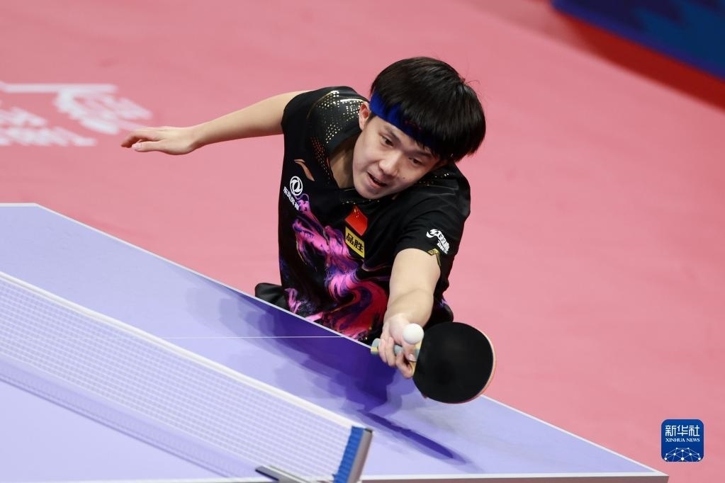 2022年10月9日,中國隊選手王楚欽在比賽中回球,他以3:0戰(zhàn)勝德國隊選手凱·斯達(dá)姆珀。當(dāng)日,在成都世乒賽男團(tuán)決賽中,中國乒乓球男隊3:0戰(zhàn)勝德國隊。 新華社記者胥冰潔攝