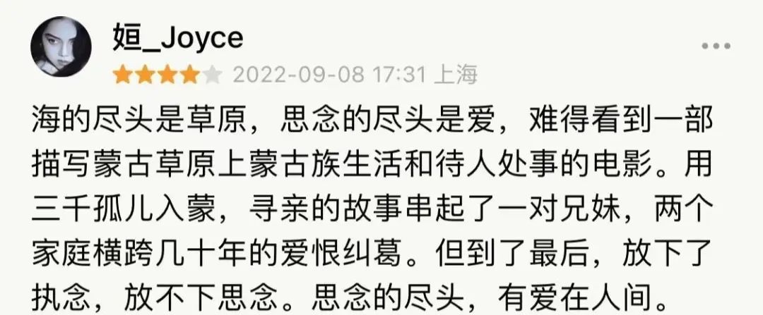 海的盡頭是草原,艱難的盡頭是大愛。新中國最難挺過的歲月里,一群脆弱的孤兒,被我們的同胞無私接納,用一生去守護。在這部真實歷史故事改編成的電影里,我們感受到的,是困厄也無法打敗的人性之光和人情溫暖。