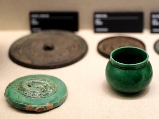 前排左:綠釉龍紋瓦當(dāng) 金代 首都博物館藏;前排右:定窯綠釉矮領(lǐng)罐 金代 中國民族博物館藏。(民族畫報(bào)記者 鷹鴿 攝)