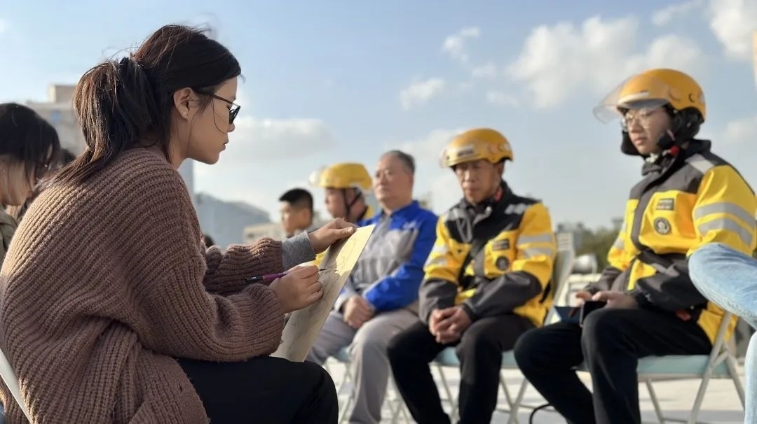 畫像小組的同學(xué)拿起手中畫筆,為團(tuán)結(jié)湖南北里社區(qū)老黨員、社區(qū)志愿者、騎手社工畫像。大家認(rèn)真描繪“模特”們和藹可親的形象,不時與“模特”聊天互動,聽他們分享自己生活中的精彩故事。除此之外,部分同學(xué)圍繞垃圾分類、廉政教育等主題為社區(qū)繪制黨建板報。通過繪制板報,傳播正能量,為社區(qū)宣傳添一份力。